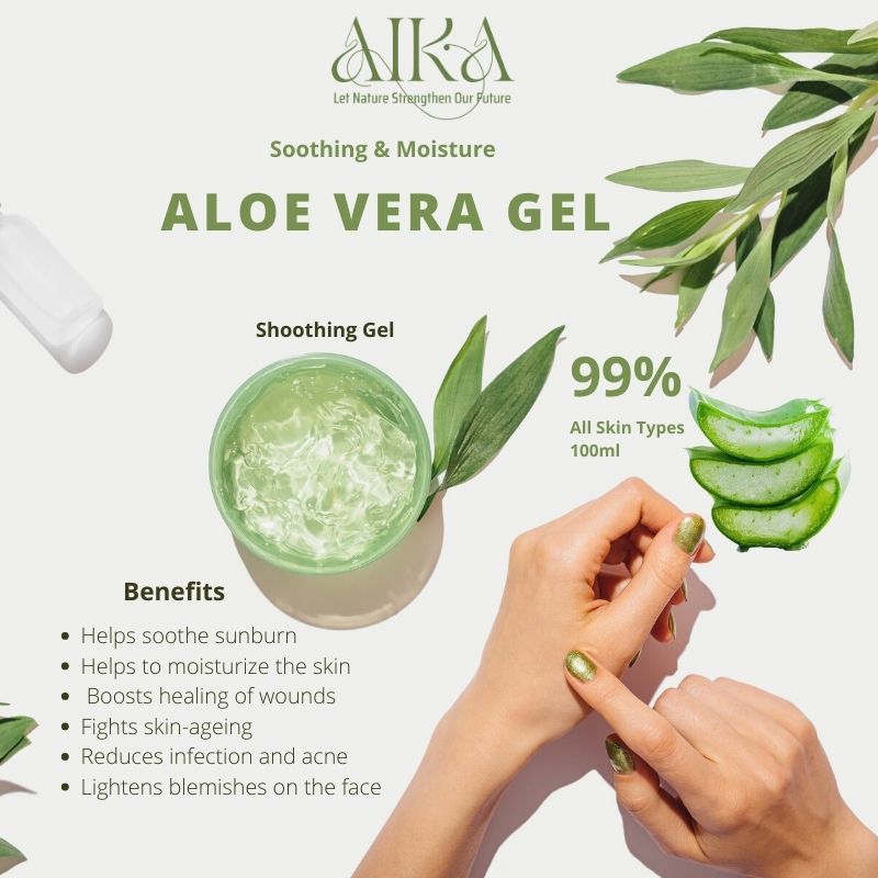 Helps soothe sunburn. Aloe Vera gel has cooling properties and is anti-inflammatory. Helps to moisturize the skin. Boosts healing of wounds. Fights skin-aging. Reduces infection and acne. Lightens blemishes on the face.